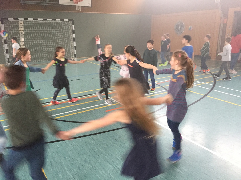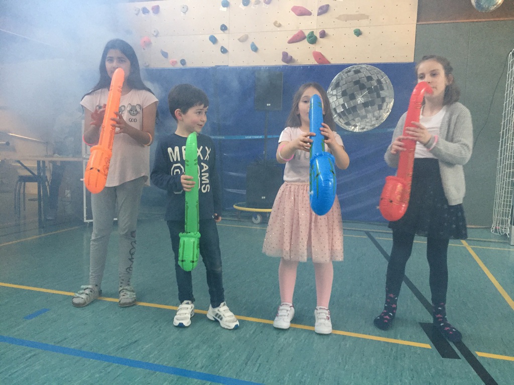Am Tag der Zeugnisausgabe wackelten erneut die Wänder der Schulturnhalle am Kreuzberg. Es wurde gerockt und gegroovt, gerobbt und getanzt, dass es eine wahre Freude war. Luftgitarren, -Saxophone und -Mikrofone waren in diesem Jahr der absolute Renner. Musikwünsche der Schülerinnen und Schüler waren bereits zuvor gesammelt worden, sodass ein jedes Kind auf seine Kosten kam. Am Ende verließen alle verschwitzt und völlig aus der Puste die Halbjahresparty.