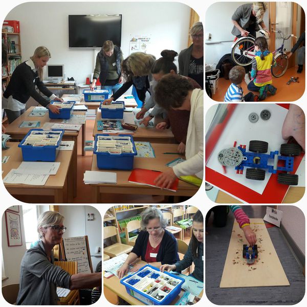 Thema der Fortbildung war: Was haben Fahrrad, Salatschleuder und Tellerbohrer gemeinsam? Mit Hilfe des LEGO Materials gingen wir dieser Frage nach und bauten in Partnerarbeit nach Anleitung Kehrmaschinen.